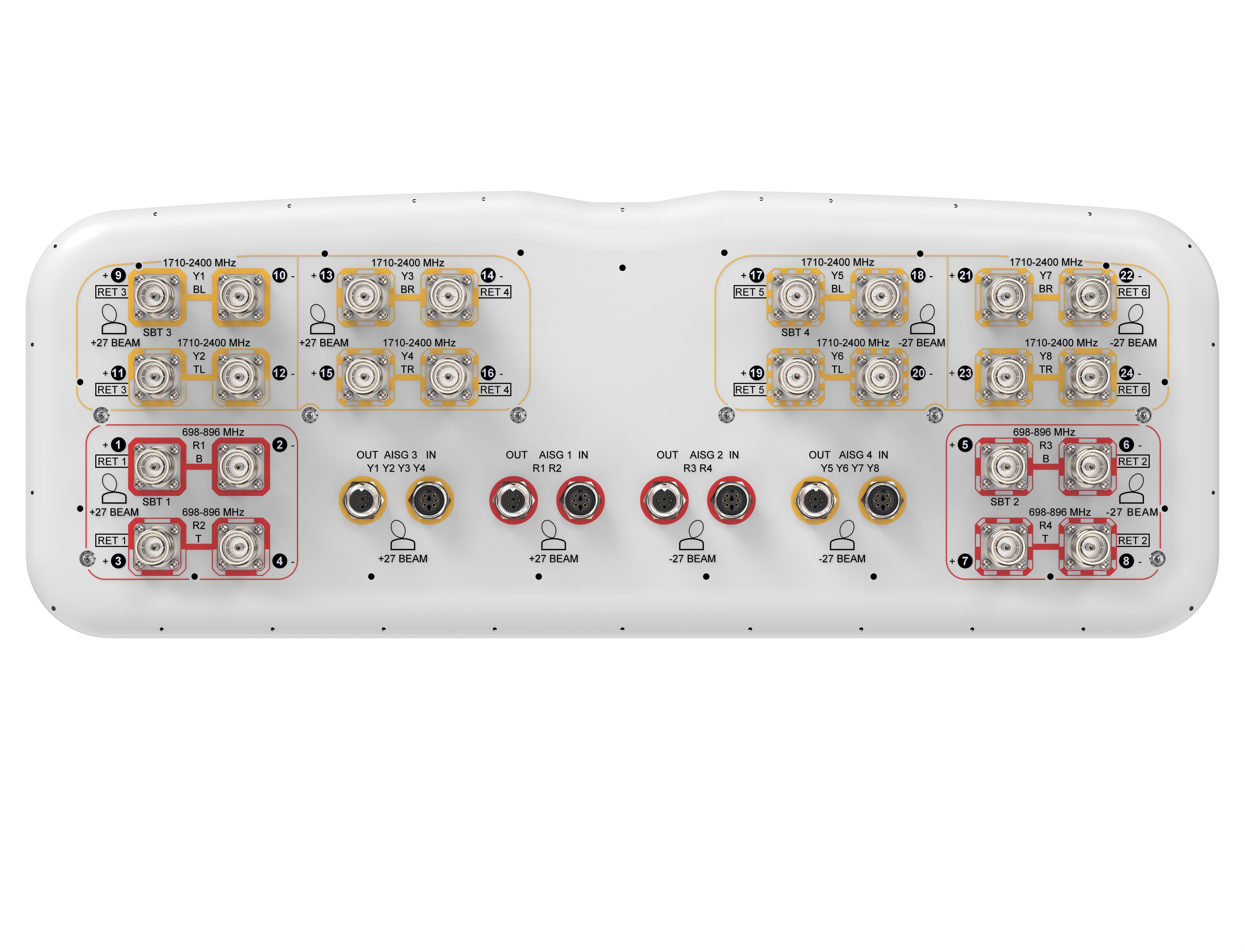 24-Port antenna, 8 x 698-896 MHz, 16 x 1710-2400 MHz, 33° HPBW, 6 x RETs, 4x SBTs, 8ft Length