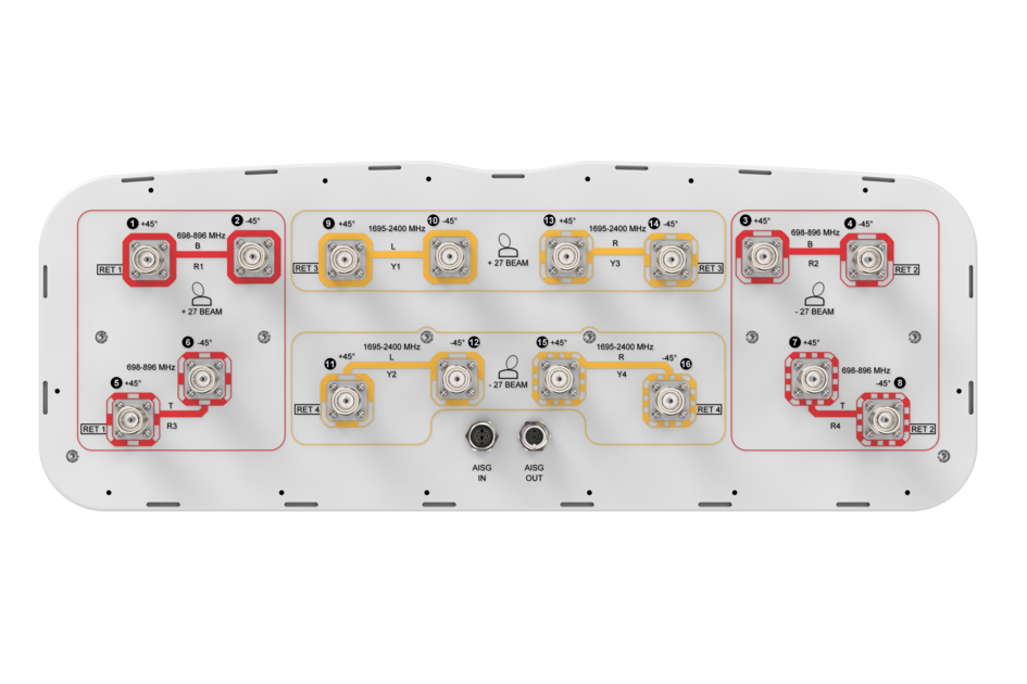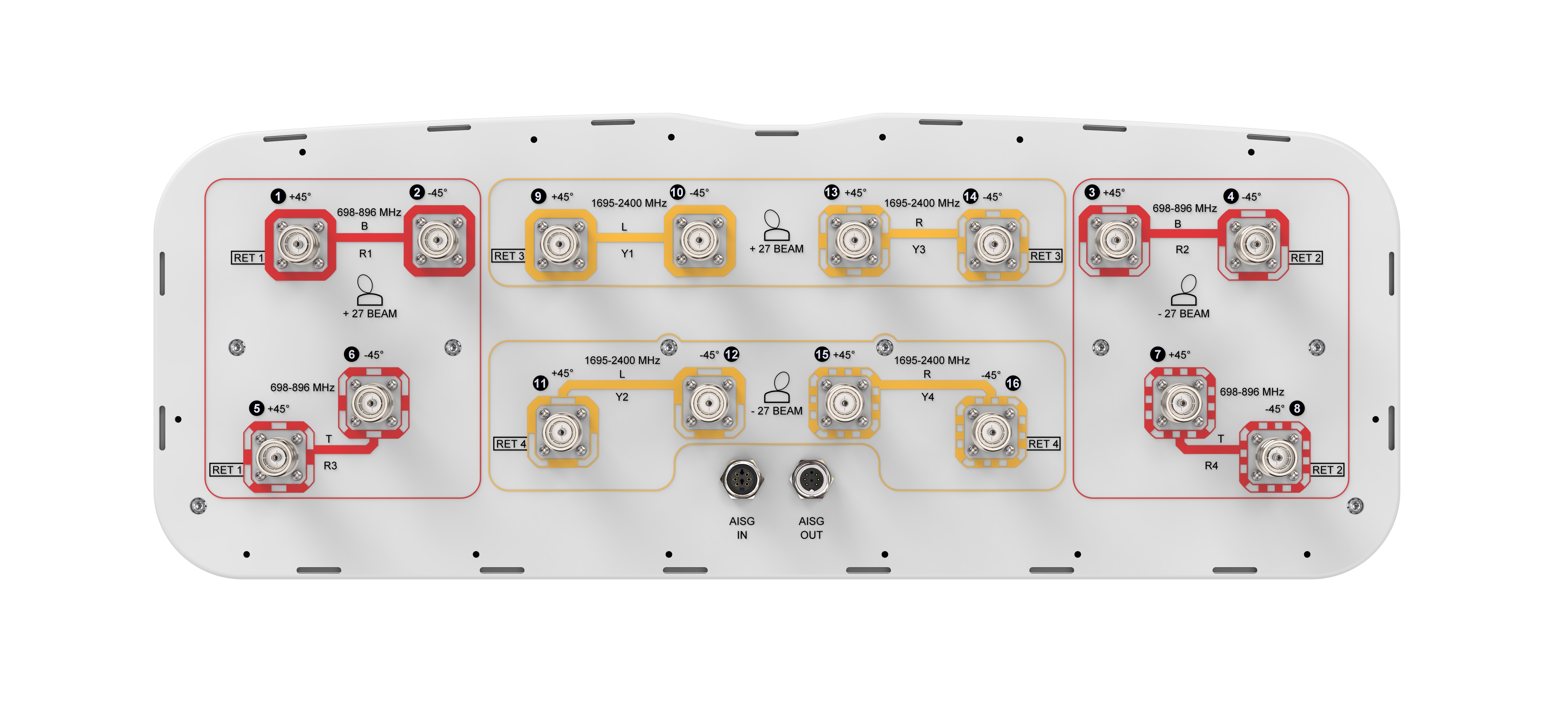 16-port multibeam antenna, 8x 698–896 MHz, 2x 2-beam 33° HPBW and 8x 1695–2400 MHz, 2x 2-beam 33° HPBW, 4x RET