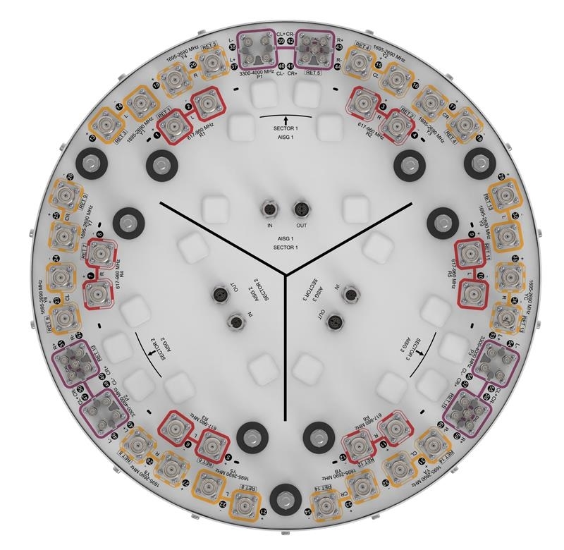 60-port sector antenna, 12x 617-960MHz, 24x 1695-2690MHz 65° HPBW and 24x 3300-4000 MHz, 90° HPBW, 15x RET