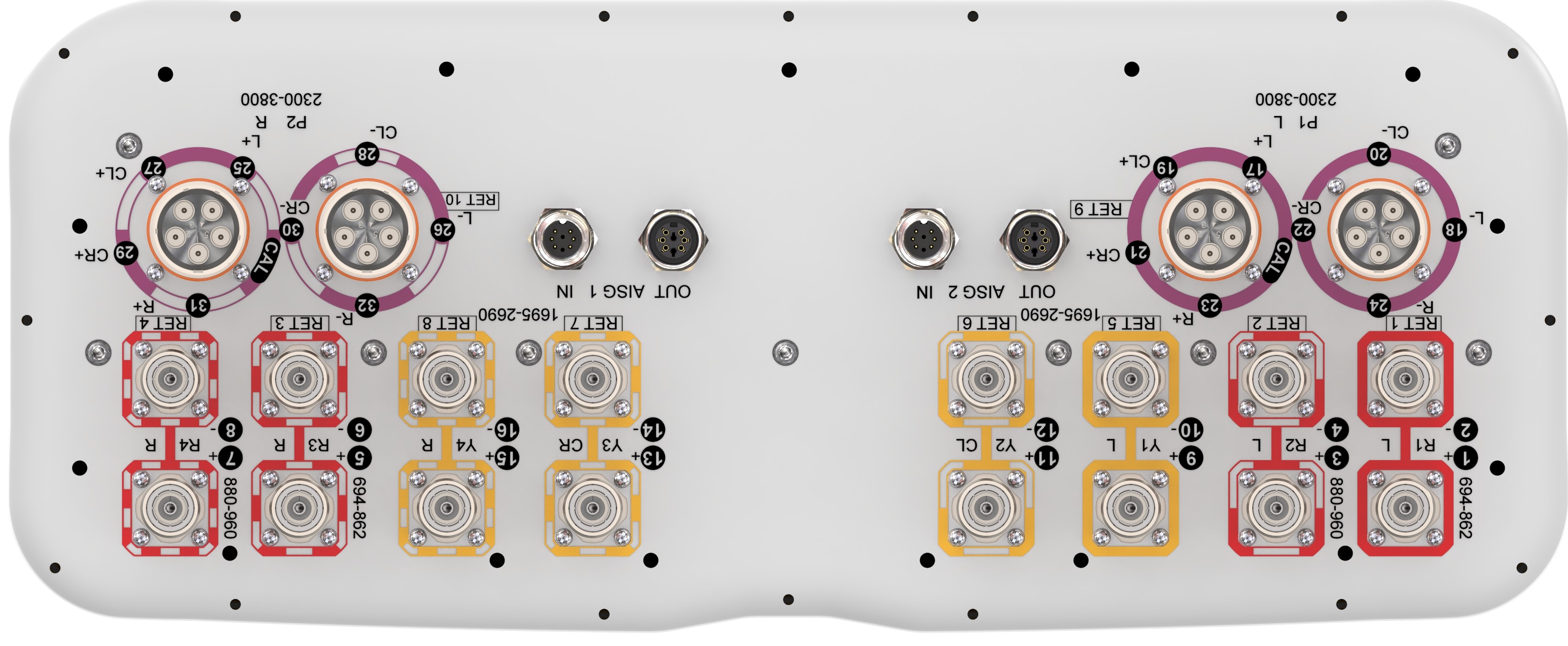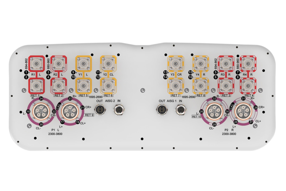 32-port sector antenna, 4 x 694-862 MHz (R1,R3), 4 x 880-960 MHz (R2,R4), and 8 x 1695-2690 MHz (Y1-Y4) 65° HPBW, 16 x 2300-3800 MHz (P1,P2), 90° HPBW, 10 x RET