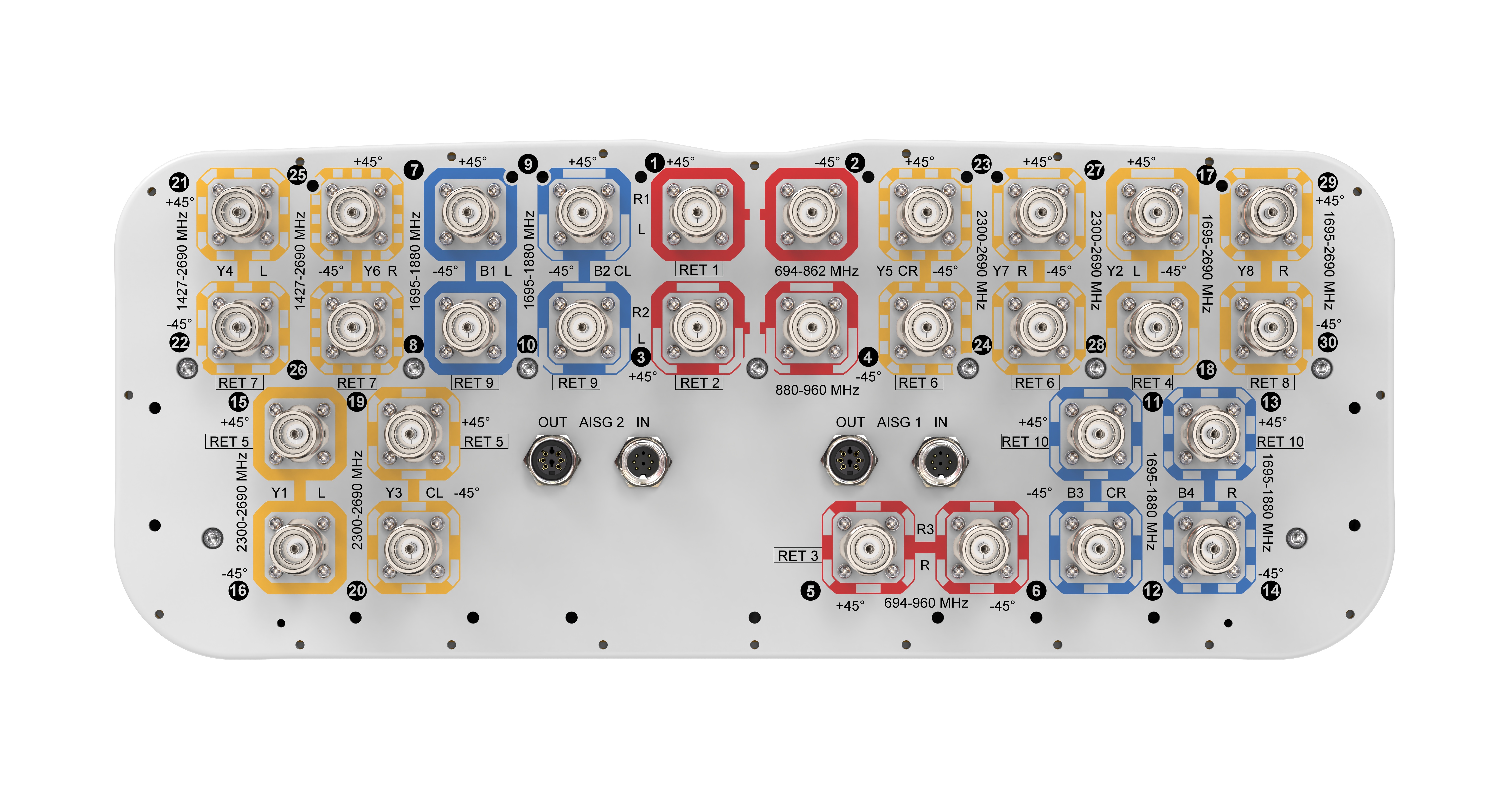30-port sector antenna, 2x 694-862 (R1), 2x 880-960 (R2), 2x 694-960 (R3), 4x 1427-2690 (Y4/Y6), 8x 1695-1880 (B1-B4), 8x 2300-2690 (Y1/Y3/Y5/Y7) & 4x 1695-2690 (Y2&Y8) MHz, 65° HPBW, 10x RET.