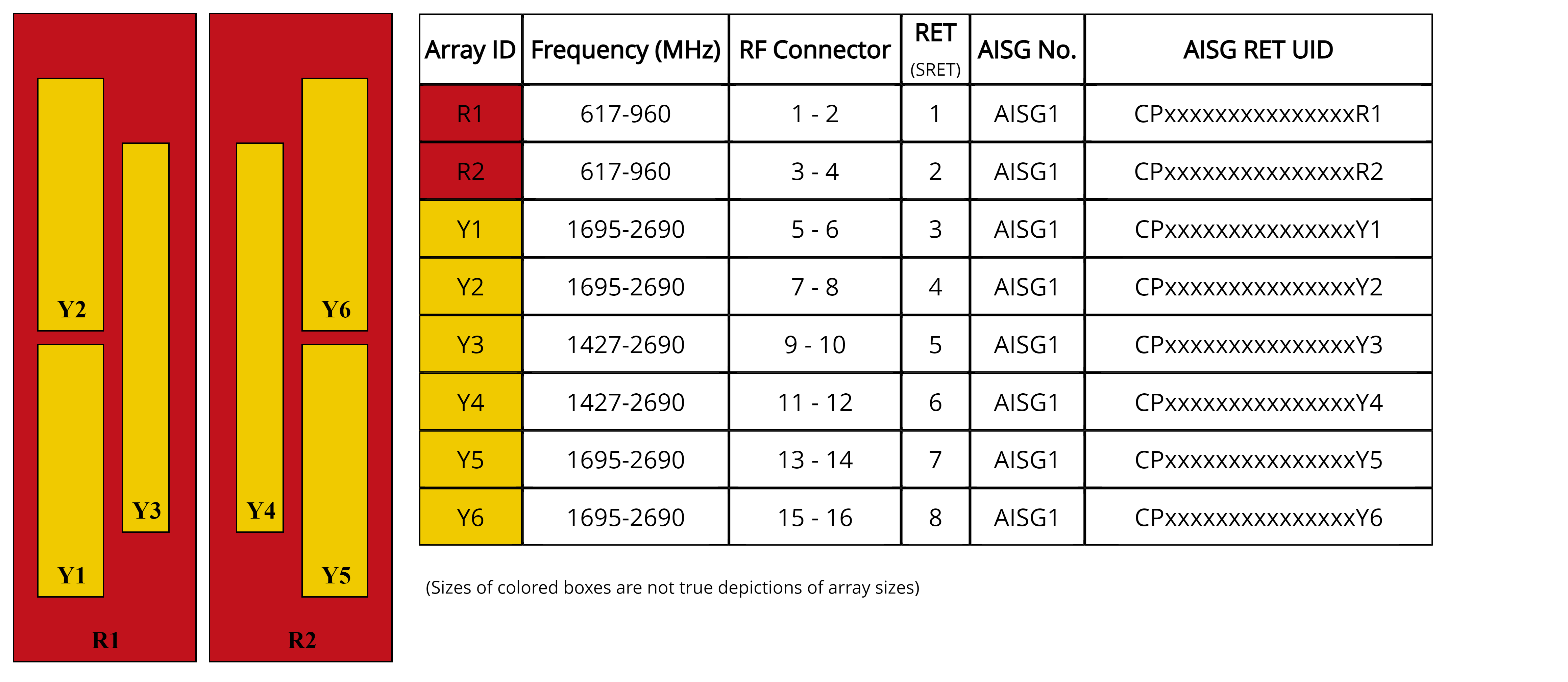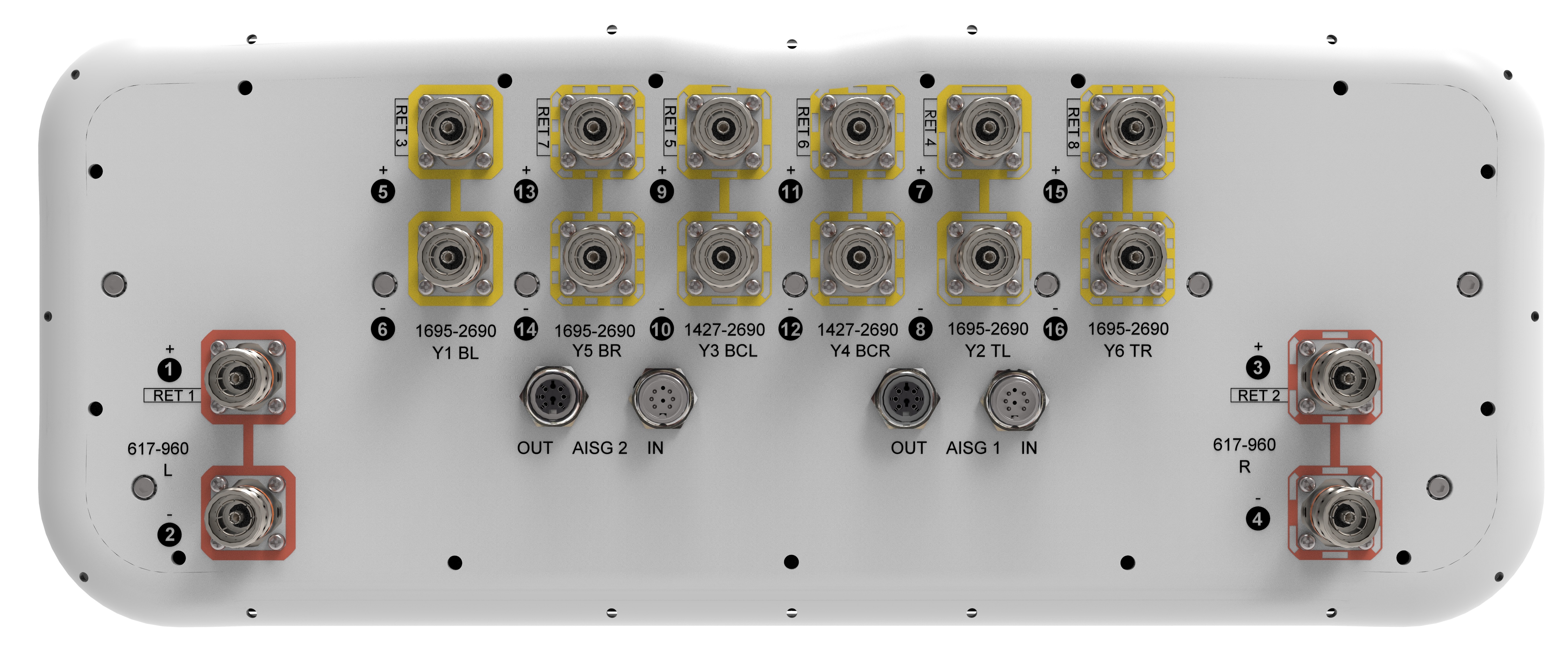 16-port sector antenna, 4x 617-960 (R1,R2), 4x 1427-2690 (Y3,Y4) & 8x 1695-2690 (Y1,Y2,Y5,Y6) MHz, 65° HPBW, 8x RET. All Internal RET actuators are connected in “Cascaded SRET” configuration