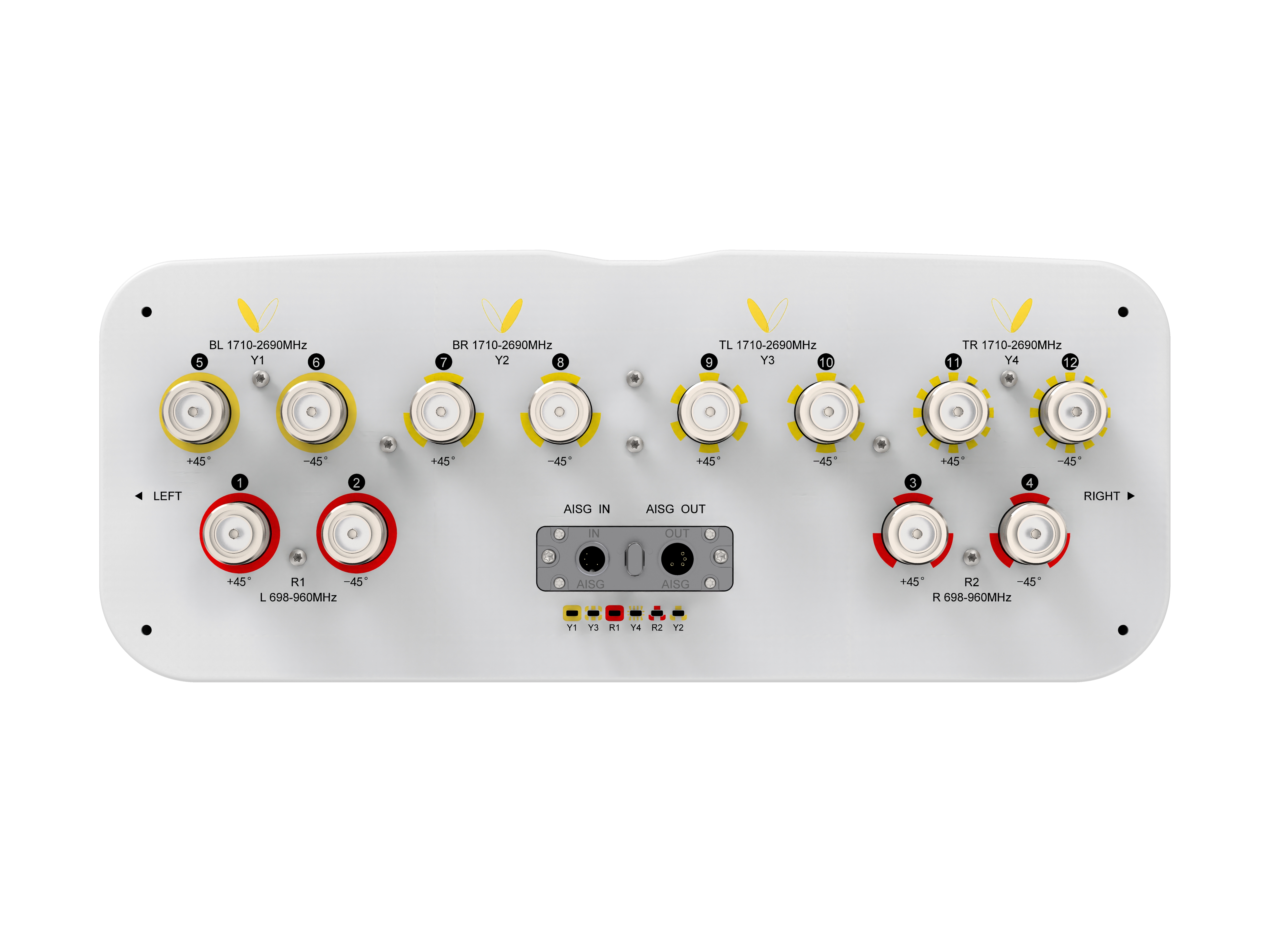 12-port sector/multibeam antenna, 4x 698–960 MHz 65° HPBW and 8x 1710–2690 MHz 33°HPBW, 6x RET