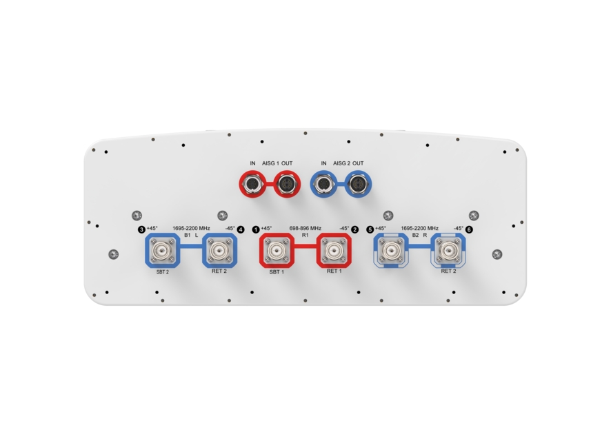 6-port Next Generation PerforMax™ sector antenna, 2x 698–896 and 4x 1695–2200 MHz, 45° HPBW, 2x RETs and 2x SBTs