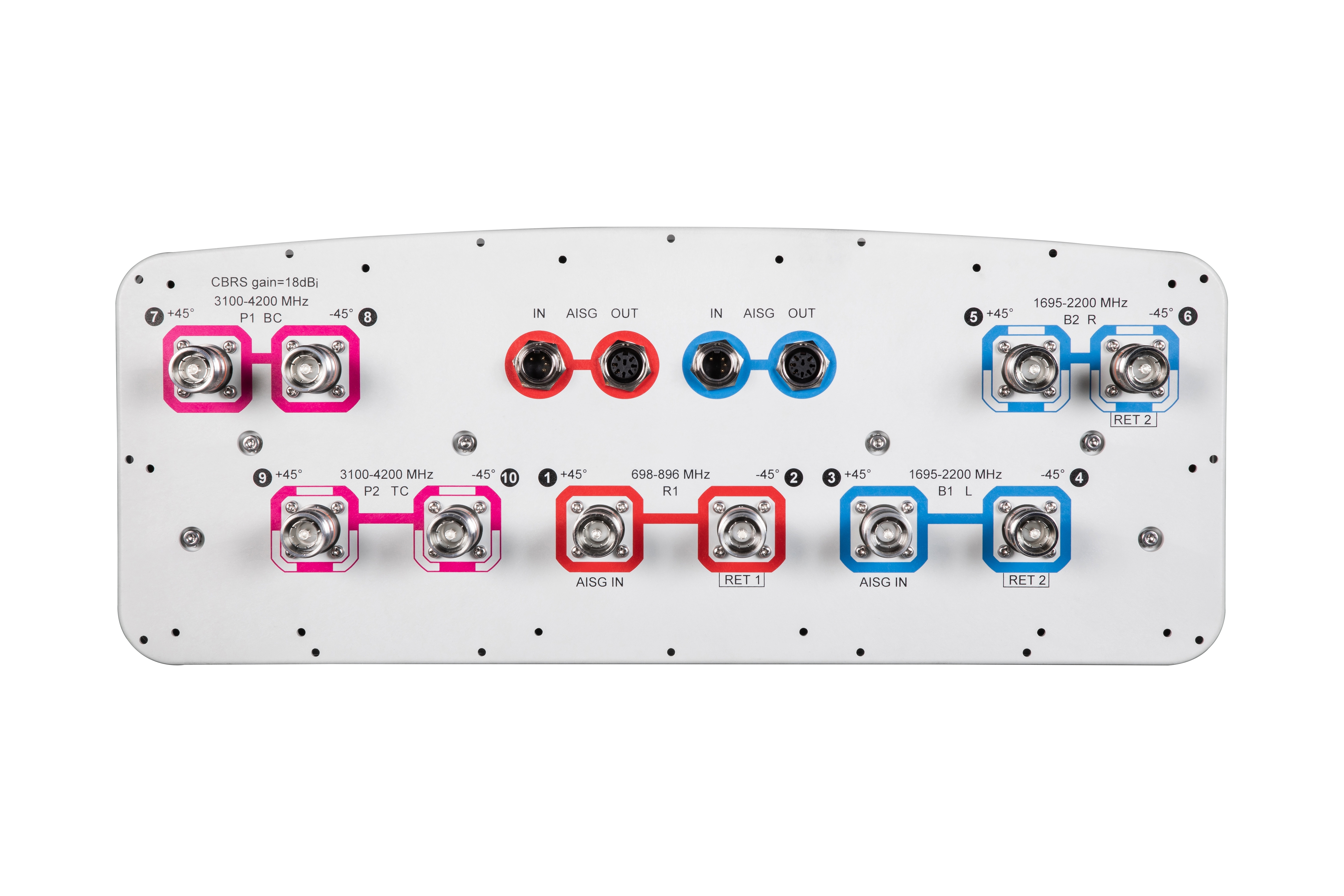 10-port sector antenna, 2x 698–896, 4x 1695–2200 MHz and 4x 3100-4200, 45° HPBW, 2x RETs and 2x SBTs. Both high bands share the same electrical tilt.