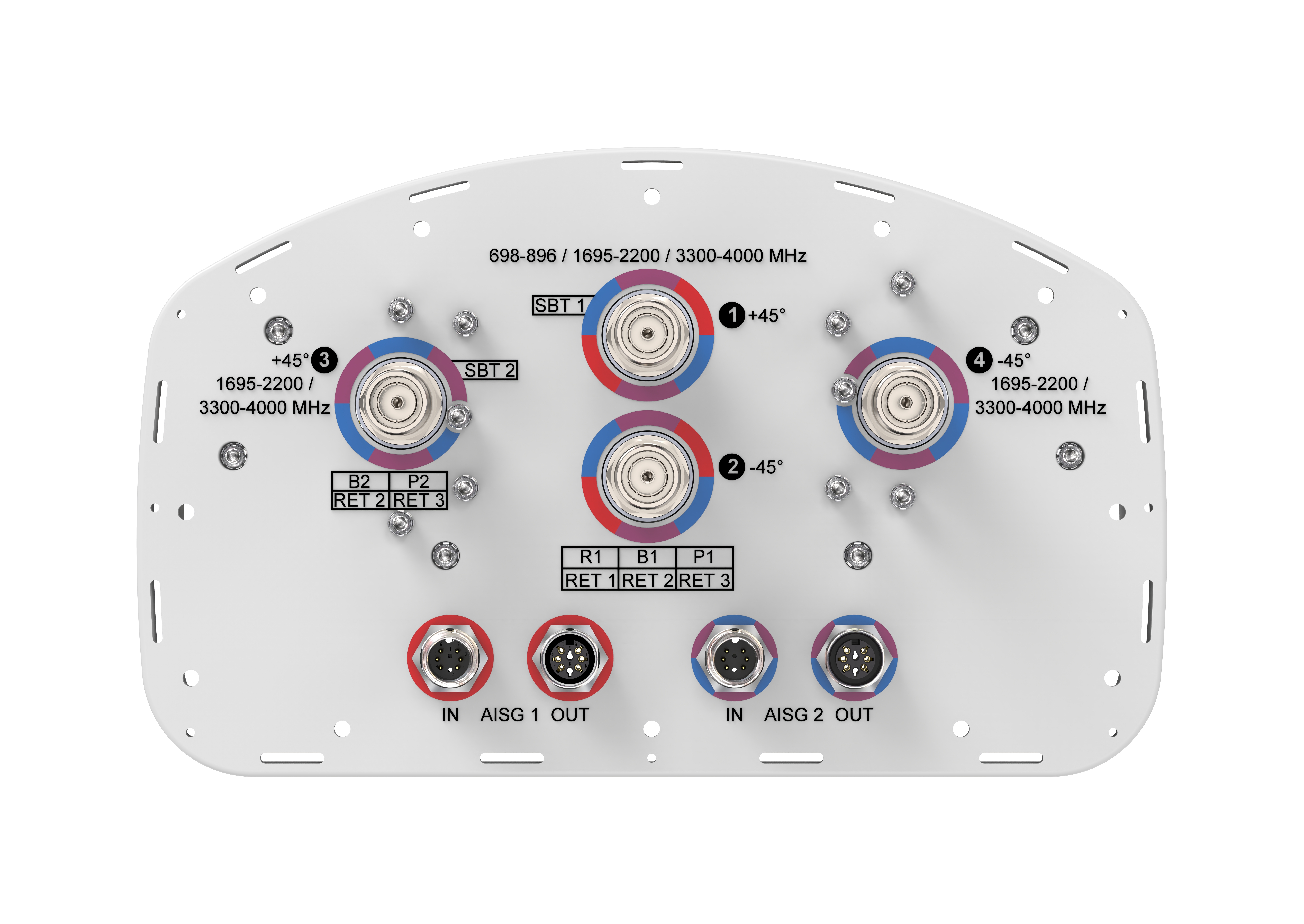 4-port Next Generation PerforMax™ sector antenna, 2x 698–896, 4x 1695–2200 and 4x 3300-4000 MHz, 65° HPBW, 3x RETs and 2x SBTs