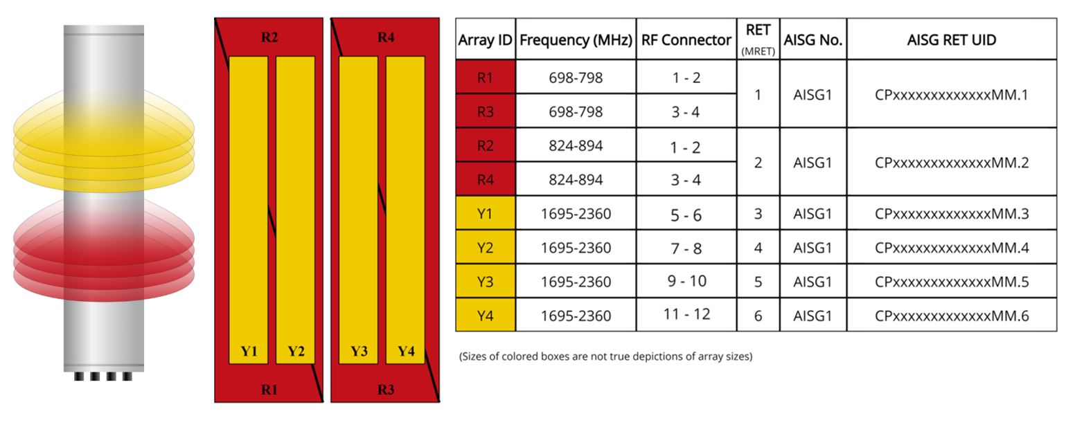 • The Low Band array is diplexed, providing independent tilt for the 700 and 850 MHz bands for 4T4R (4X MIMO) capability when used with Dual Band radios