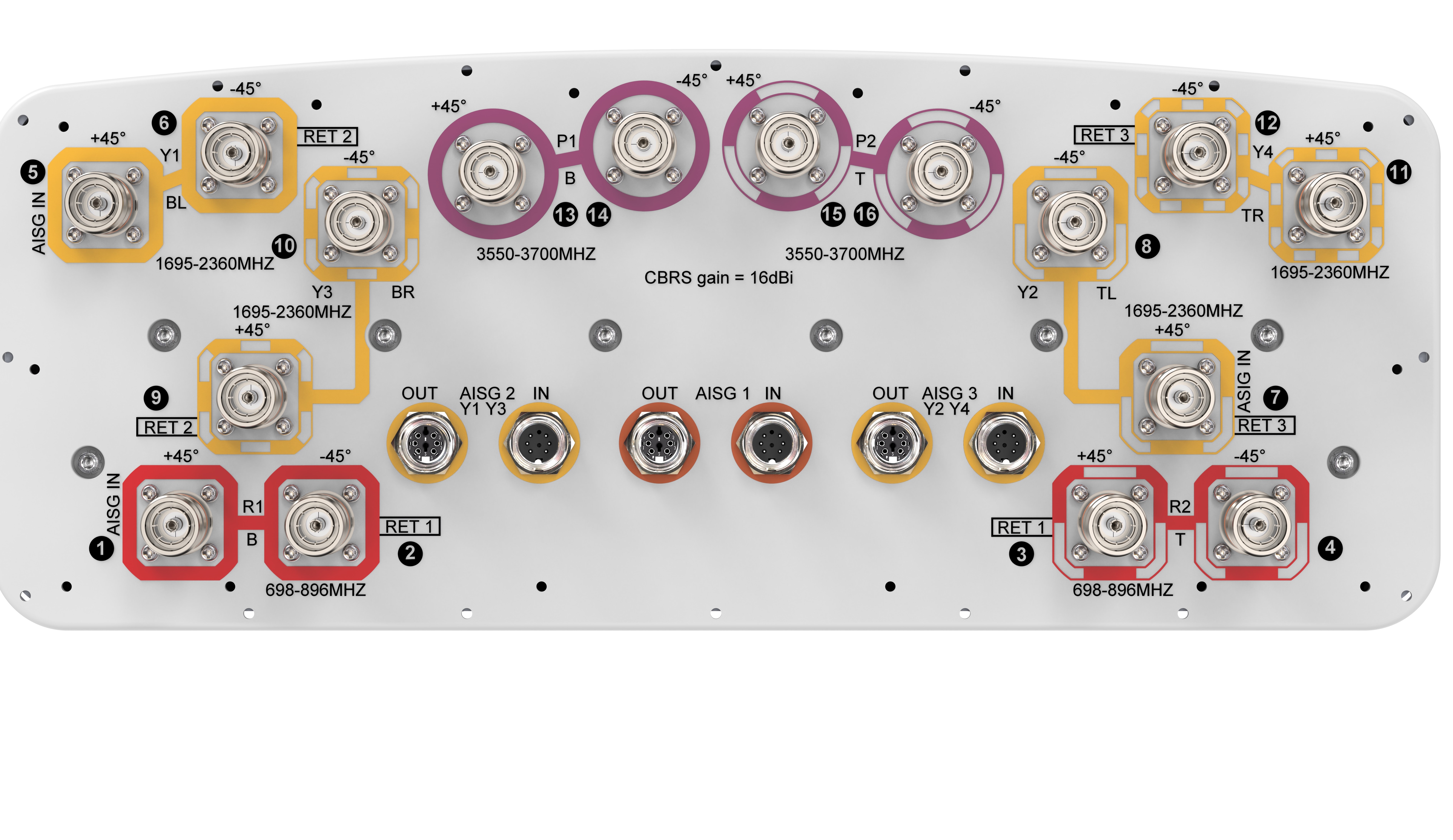 16-port sector antenna, 4x 698–896, 8x 1695–2360 and 4x 3550- 3700 MHz, 45° HPBW, 3x RETs and 3x SBTs.