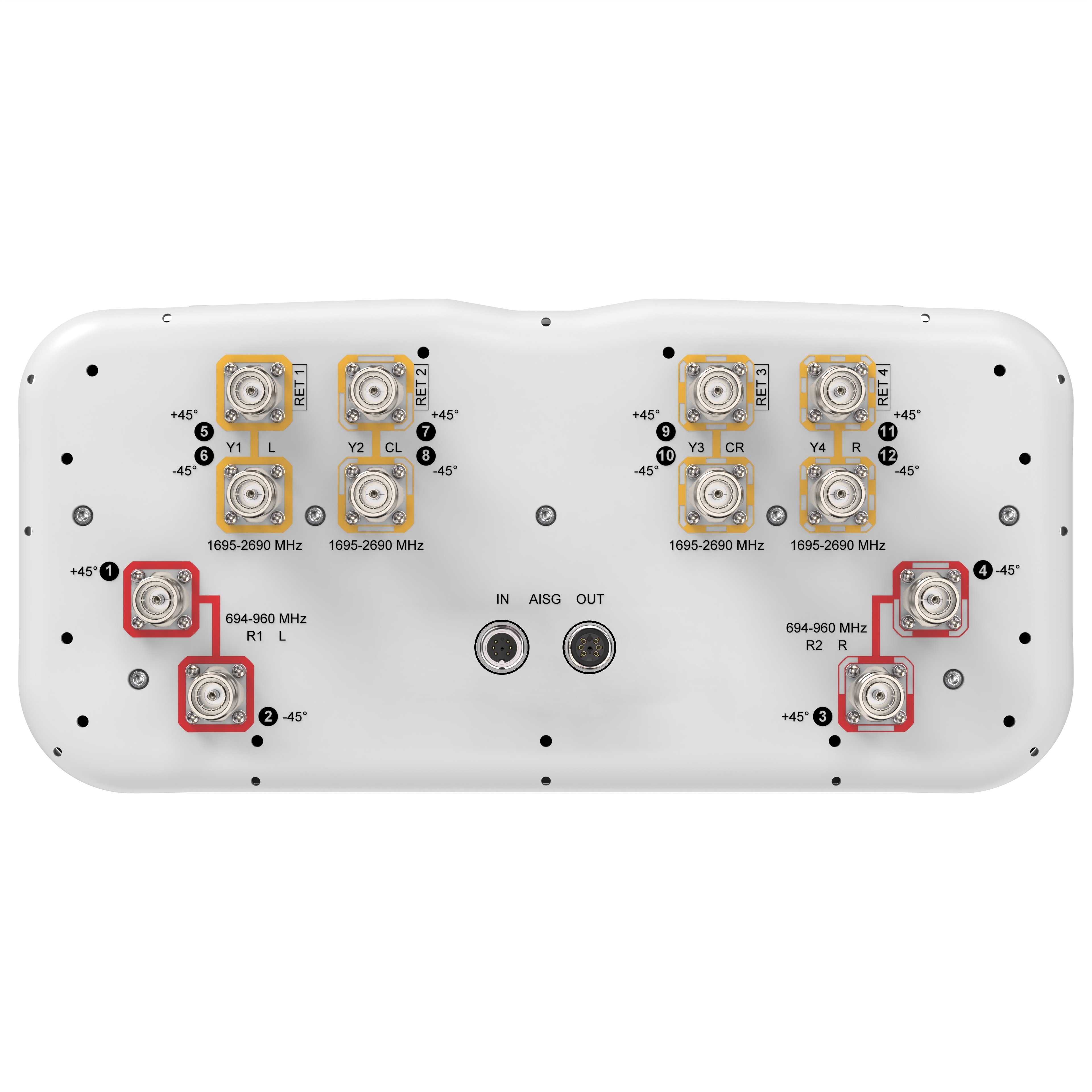 12-port sector antenna, 4x 694–960MHz 8deg fixed tilt and 8x 1695-2690 MHz, 65° HPBW, 4x RET