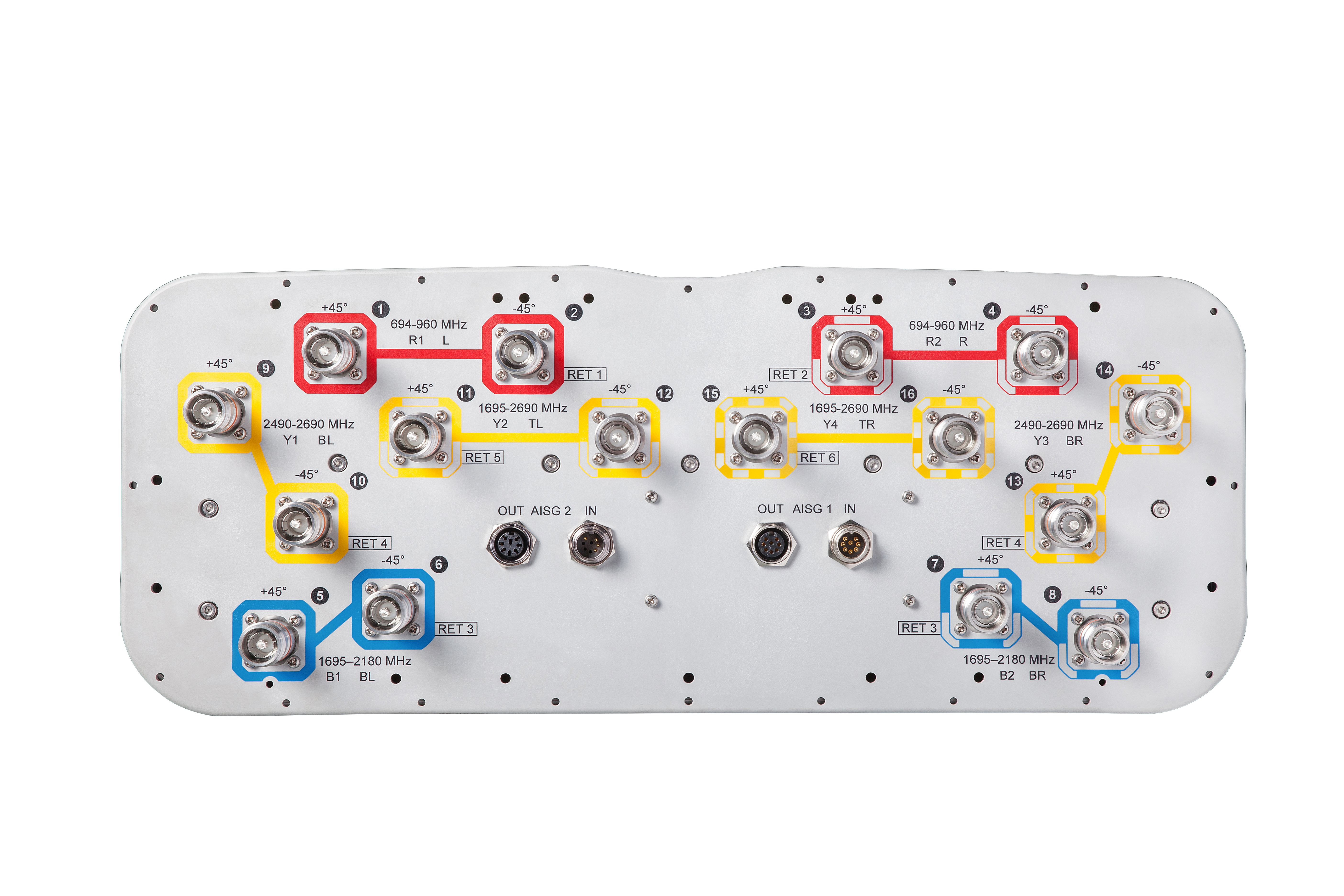 1. 16-port, sector antenna, RF port assignments are as follows: R1+R2 = 694–960, Y2+Y4 = 1695-2690MHz, B1+B2 = 1695–2180 and Y1+Y3 = 2490-2690 MHz, 65° horizontal beamwidth, 6x Internal RET. B1+B2 and Y1+Y3 share common RET, 2.7m