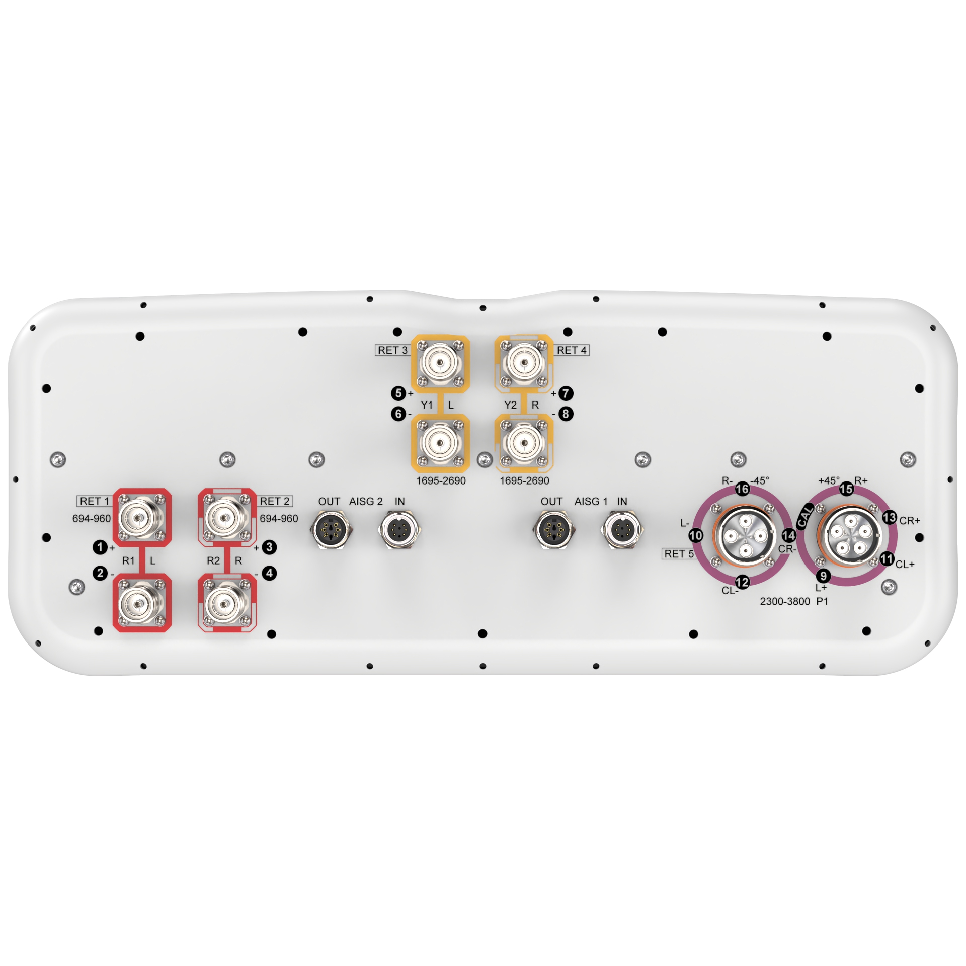 16-port sector antenna,4 x 694-960 MHz (R1-R2), and 4 x 1695-2690 MHz (Y1-Y2) 65° HPBW, 8 x 2300-3800 MHz (P1), 90° HPBW, 5 x RET