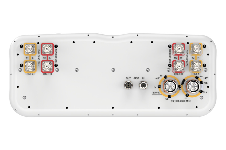 16-port sector antenna, 4x 694-960, 4x 1427-2690 MHz, 65° HPBW and 8x 1695-2690 MHz, 90° HPBW, 5x RET