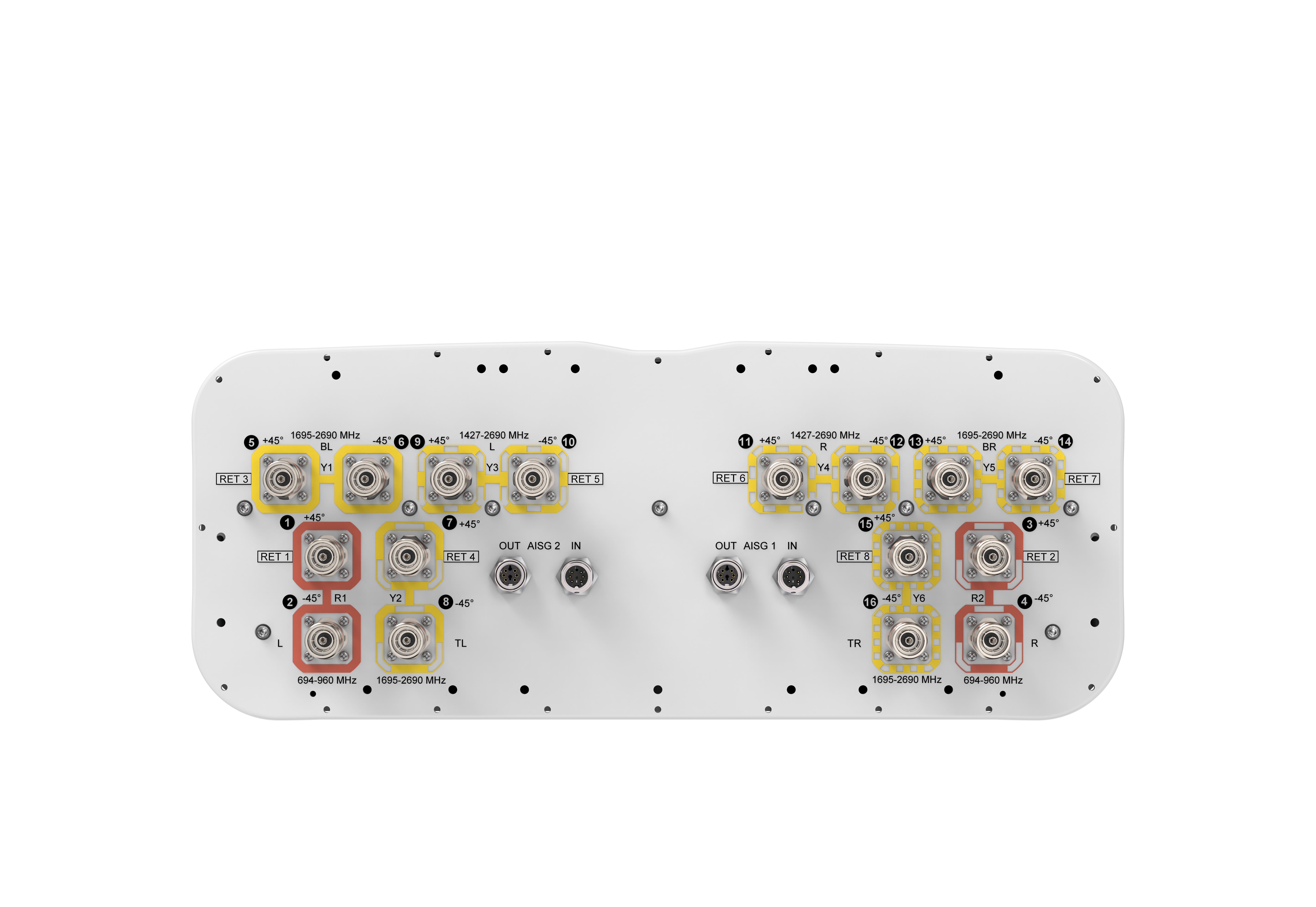 16-port sector antenna, 4x694-960 (R1 & R2), 4x1427-2690 (Y3 & Y4) and 8 x 1695-2690 MHz (Y1/Y2/Y5/Y6), 65° HPBW, 8xRET