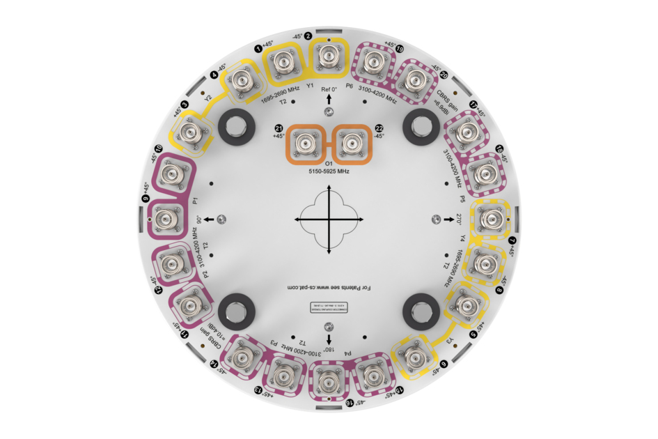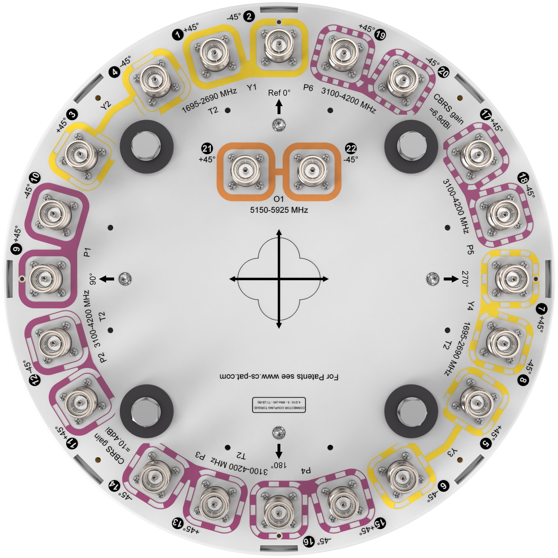 22-port small cell antenna, 8x 1695-2690, 8x 3100- 4200,4x 3100-4200, 2x 5150-5925 MHz, 360° Horizontal Beamwidth, fixed tilt.