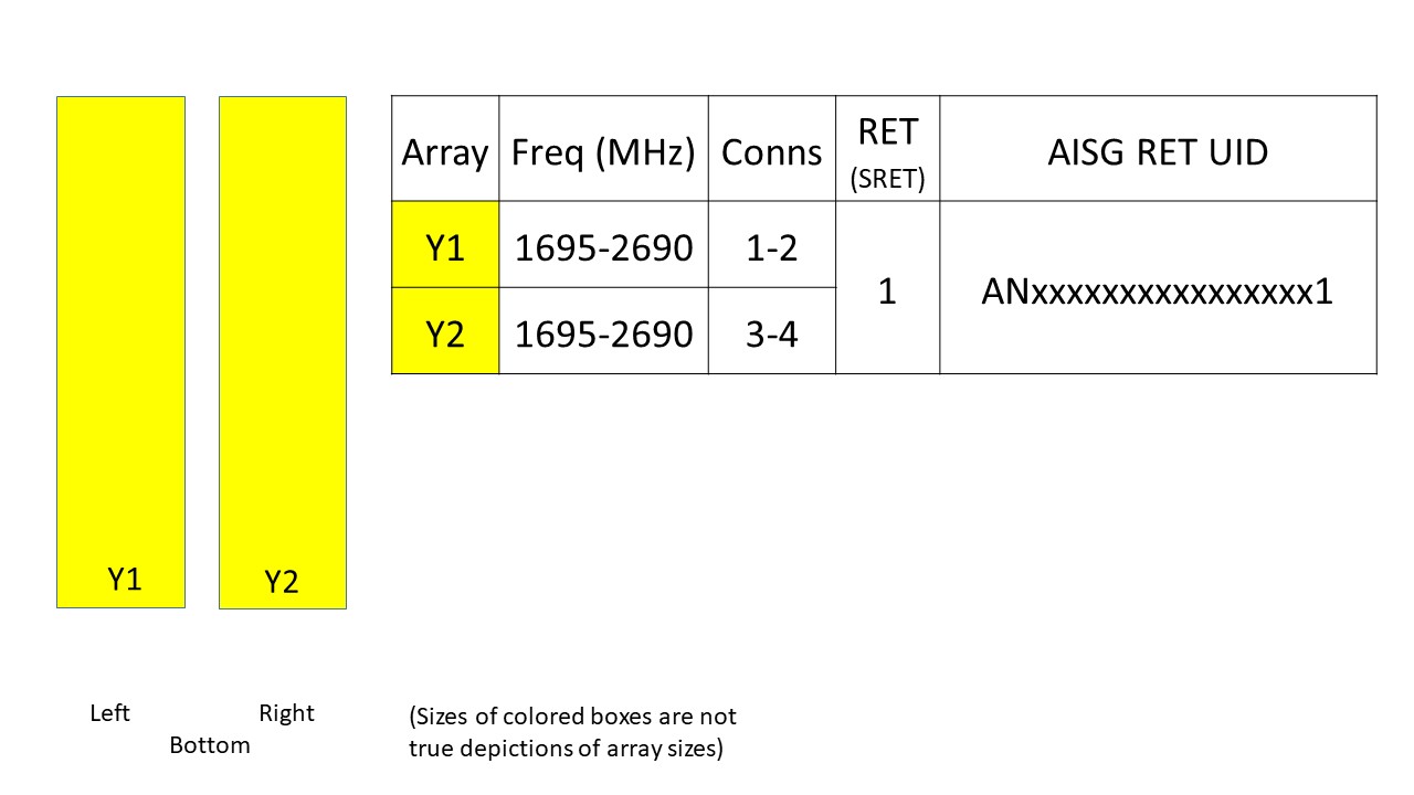 4-port sector antenna, 4x 1695–2690 MHz, 65° HPBW, 1x RET and internal Bias-T on first highband port. The two highband arrays utilize a common tilt.