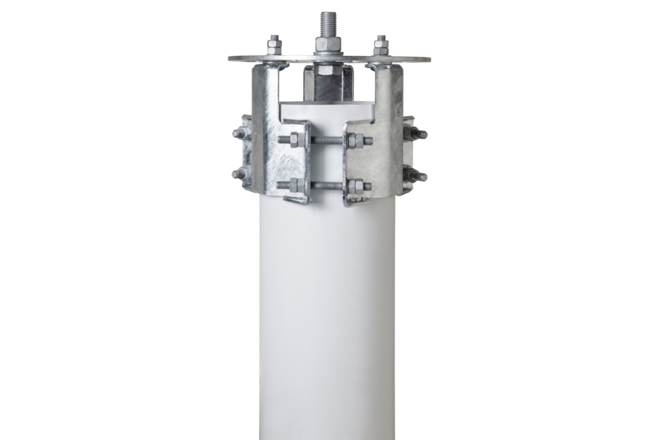 Small Cell mounting kit with shroud. Capability of mounting round antenna types on the top of a pole. For installations of 12 inch canister small cell antennas on top of poles with diameter from 160 to 216mm (6.3” to 8.5”)