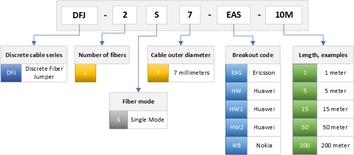 HELIAX® Discrete, 2 single mode fiber, 7 mm LSZH cable. End 1: DLC 70mm breakout. End 2: DLC 70mm breakout