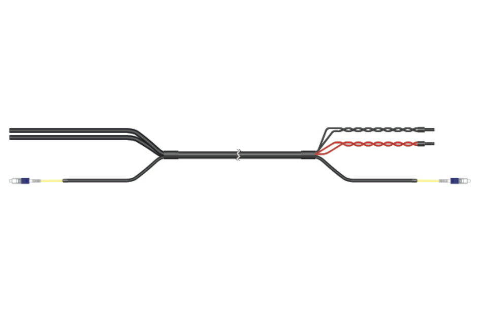 HELIAX® Hybrid Cable Assembly, BiDi, 6-OVP box to RRU, UL Type TC-ER, 4 power conductors 10 AWG at OVP, 2 power cords 8 AWG at RRU, 1 Simplex fiber connectors, PVC jacket, aluminum armor, OVP gland insert kit included