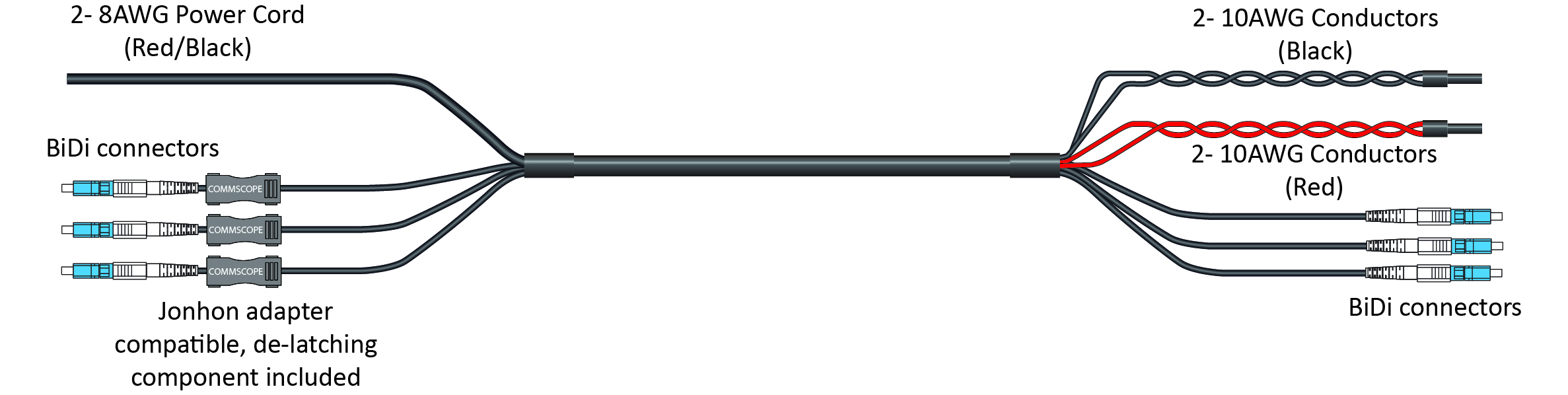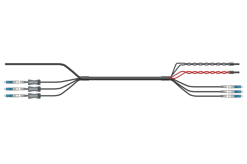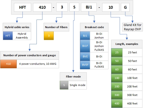HELIAX® Hybrid Cable Assembly, 6-OVP box to RRU, Power Cord to RRU, UL Type TC-ER, 4 power conductors 8 AWG RRU, 10 AWG BBU, 3-fiber, Bi-Di, Jonhon Adapter Compatible, PVC jacket, aluminum armor, OVP gland insert kit included