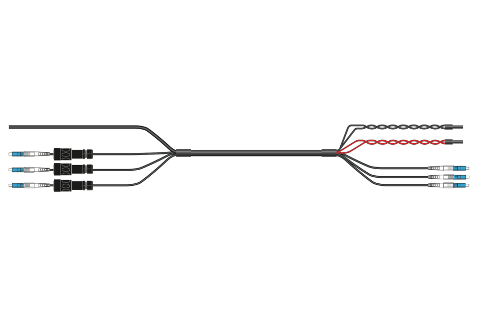 HELIAX® Hybrid Cable Assembly, BiDi, 6-OVP box to RRU, UL Type TC-ER, 4 power conductors 10 AWG at OVP, 1 power cord 8 AWG at RRU, 3 Simplex fiber connectors, FullAXS, PVC jacket, aluminum armor, weather shroud installed, OVP gland insert kit included
