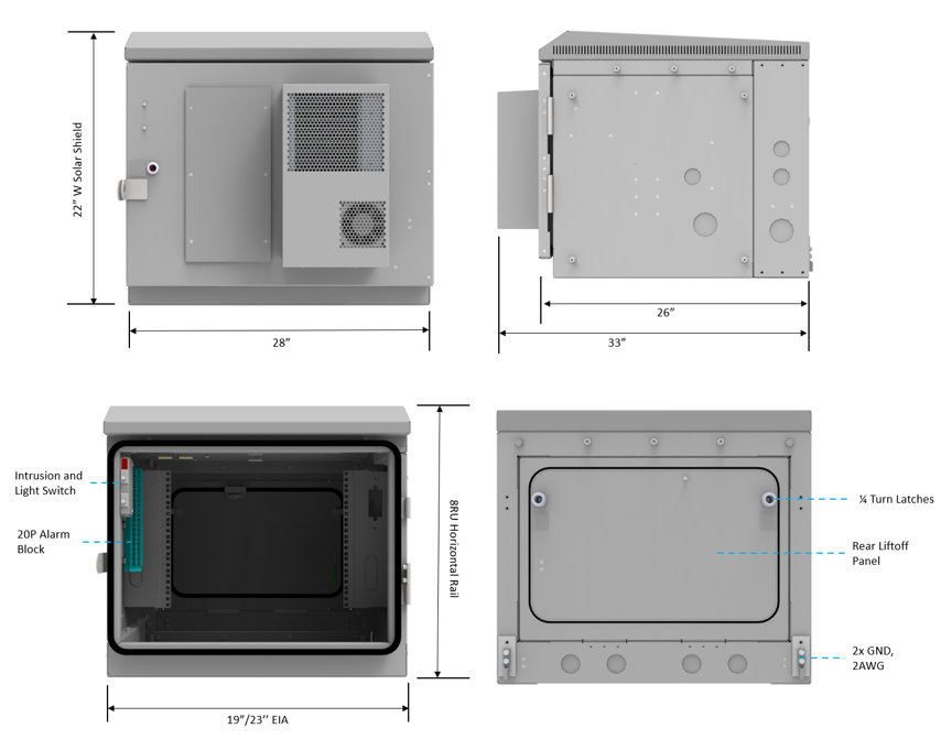 - Provides 8RU of 19” or 23" Rack Space for Equipment