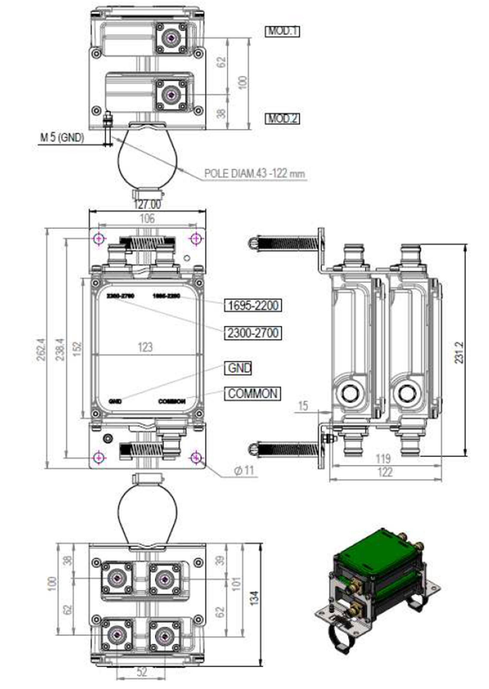- Designed for network modernization application, introduction of LTE2300 and LTE2600 on existing site