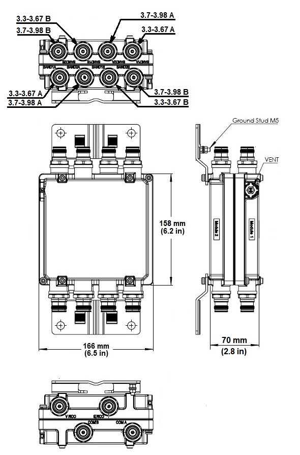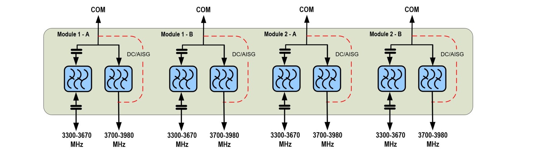 Compact Quad Diplexer 3300-3670/3700-3980 MHz, DC on 3700-3980 MHz port, 4.3-10