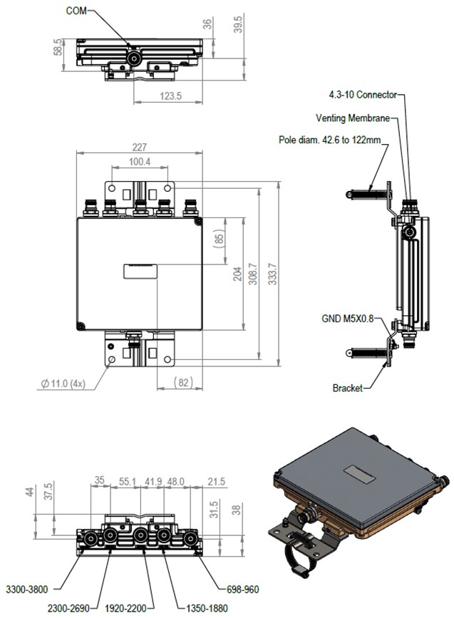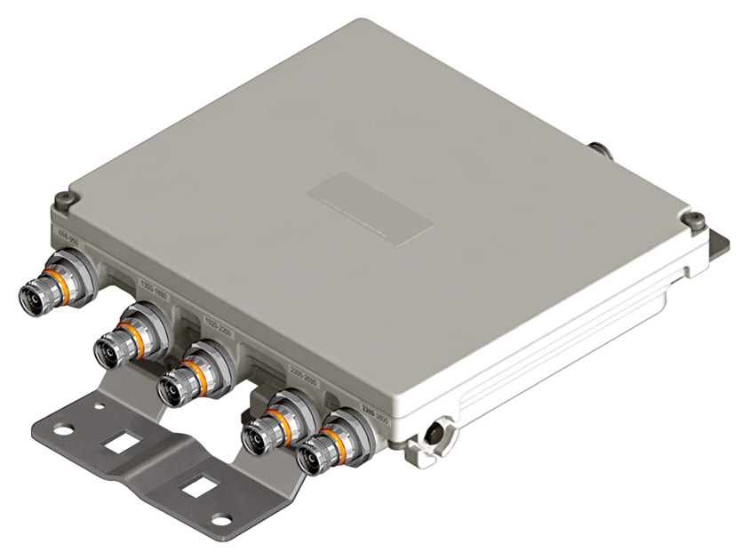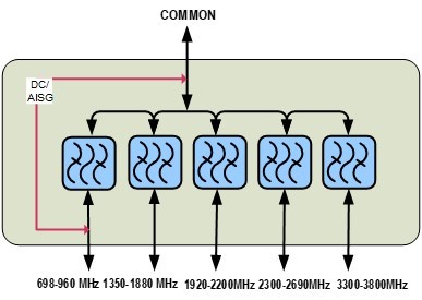 Ultra Compact Single Pentaplexer 700-900/1400-1800/2100/2300-2600/3300-3800, dc bypass on low band, with 4.3-10 connectors
