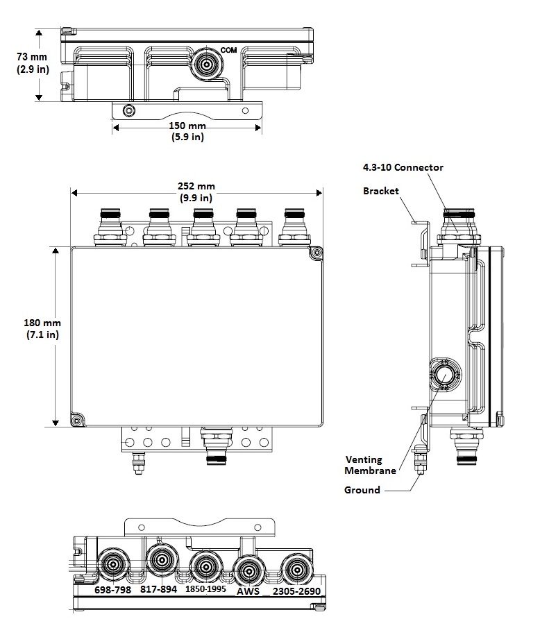 Compact Pentaplexer, 700/850/PCS/AWS/WCS-BRS, 4.3-10