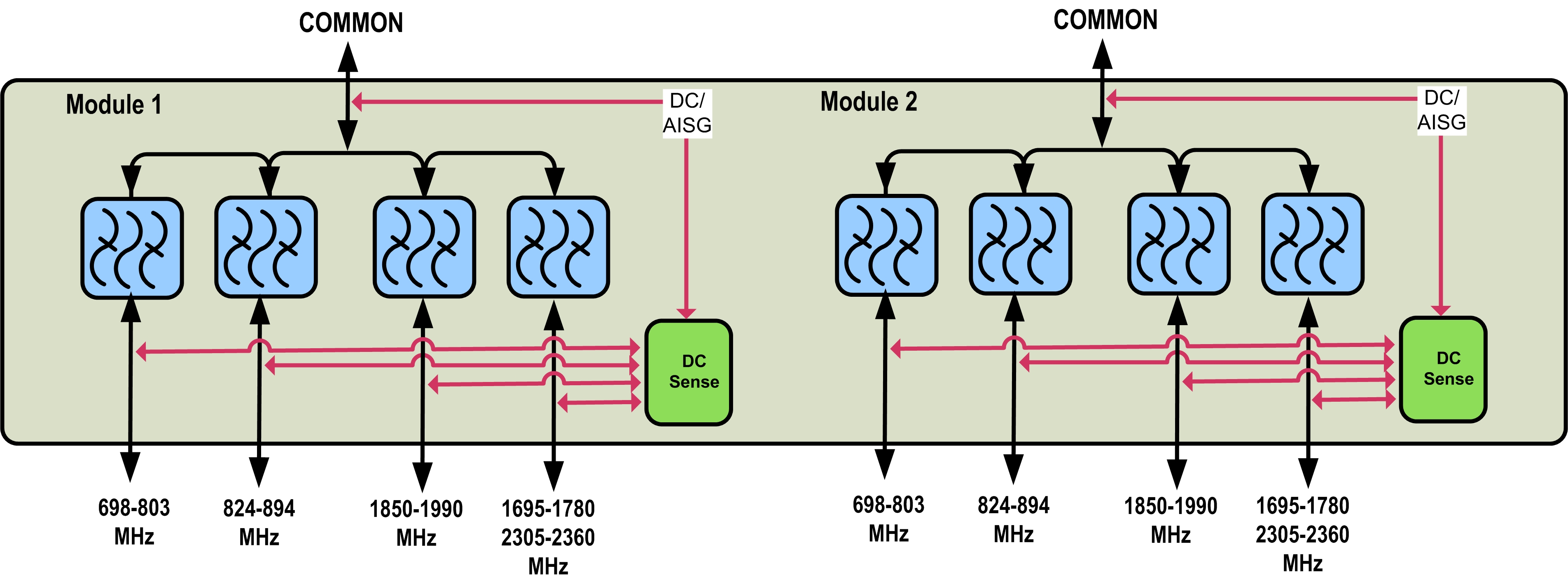 Twin Quadplexer, 700/850/PCS/AWS-WCS, DC Sense, 4.3-10