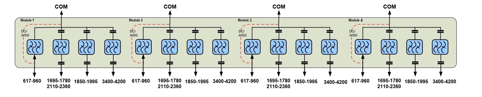 Isolation, minimum, dB 35 @ 1695–2360; 50 @ 3400–4200 35 @ 1695–1780; 35 @ 2110–2360; 35 @ 617–960; 50 @ 3400–4200 35 @ 1850–1995; 35 @ 617–960; 50 @ 3400–4200 35