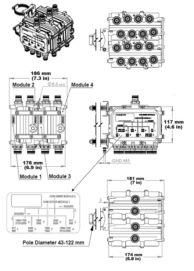 Compact Quad Quadplexer 617-960/AWS-WCS/PCS/ CBRS-C-Band, DC on 617-960, 4.3-10 connectors