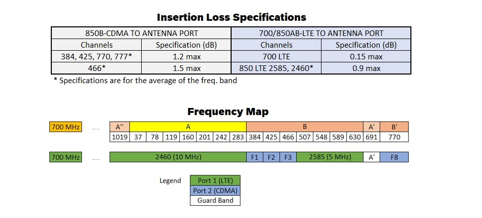 - Optimized for 5MHz LTE carrier on B-Block CH 2585 and 10MHz LTE carrier on A-Block CH 2460