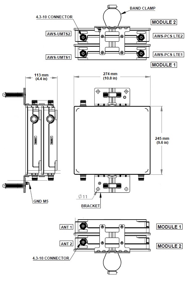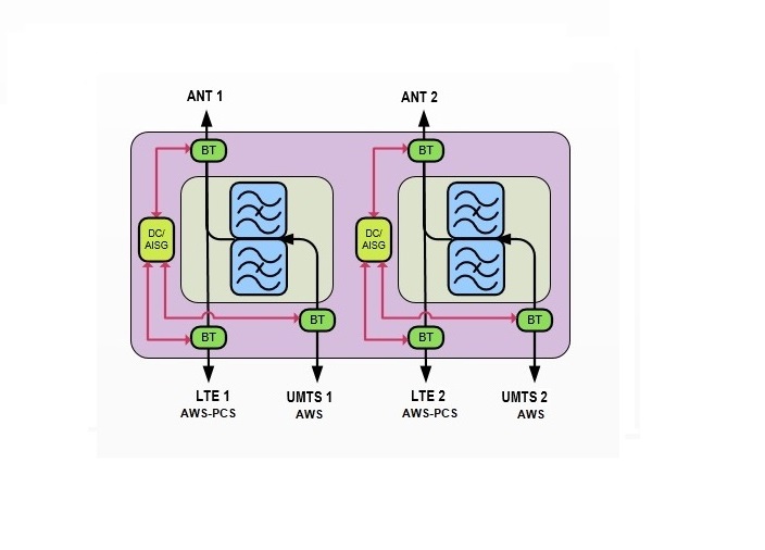 AWS Twin In-Band Diplexer Zero Guard Band, AWS DEF blocks + PCS / AWS C block with DC/AISG Sense and 4.3-10 Connectors