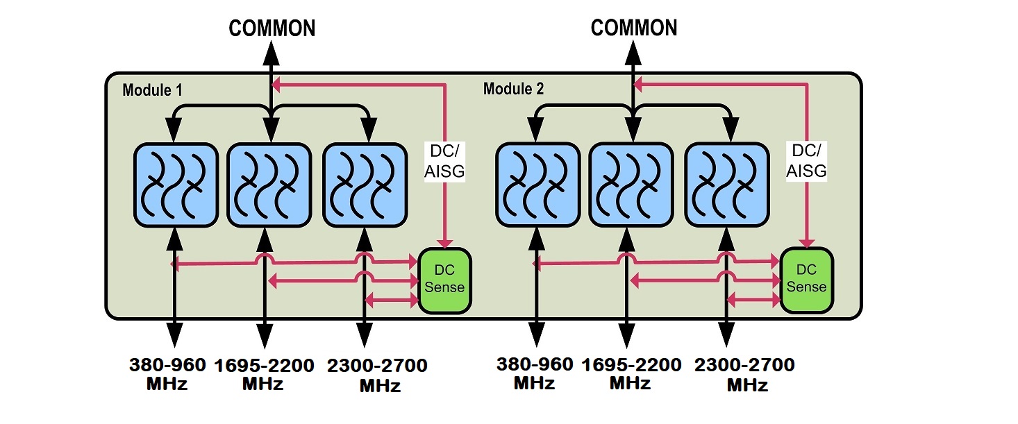 Twin Triplexer 380-960/1695-2200/2300- 2700, DC-sense with 4.3-10 connectors