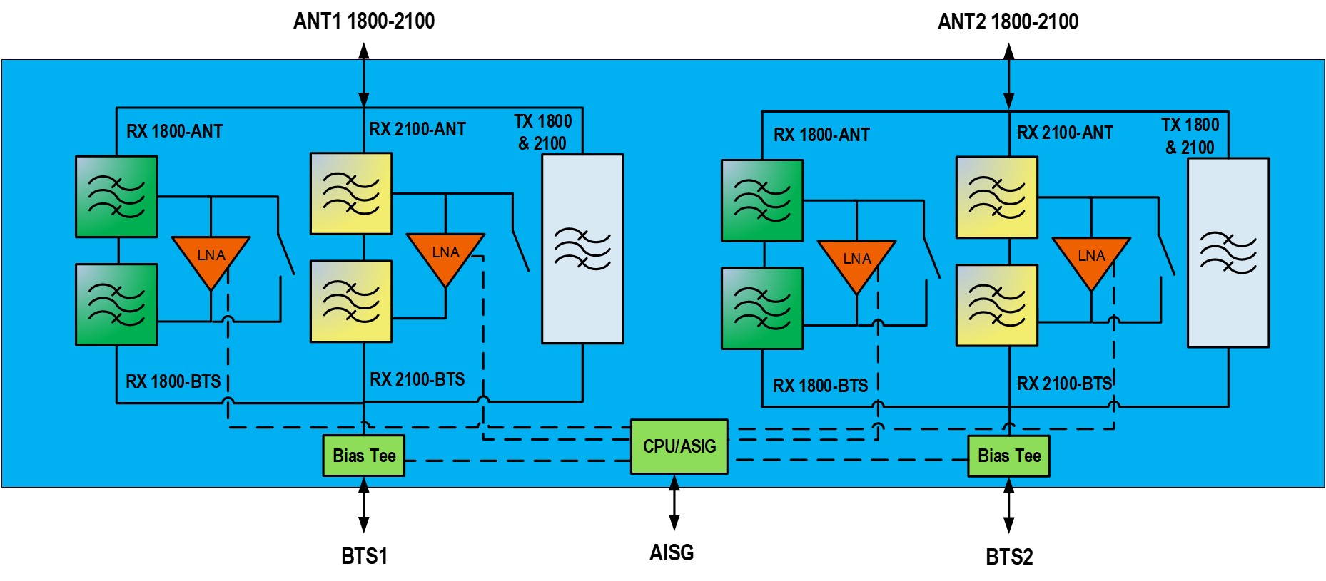 Dual Band Tower Mounted Amplifier, 1800//2100 MHz, 12 dB, 2 BTS & 2 ANT ports, with 4.3-10 connectors, AISG with 1 RET connector (2 devices with 2 sub-units each)