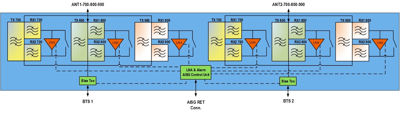 Tri Band Tower Mounted Amplifier, 700//800//900 MHz, 12 dB, 2 BTS & 2 ANT ports, AISG with 1 RET connector (3 device with 2 sub-units each)
